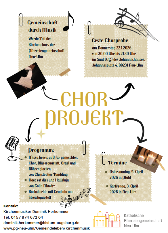 Kirchenchor Neu-Ulm Kath. Pfarreiengemeinschaft Neu-UlmJohannesplatz 489231Neu-Ulmdominik.herkommer@bistum-augsburg.de0157874672 64